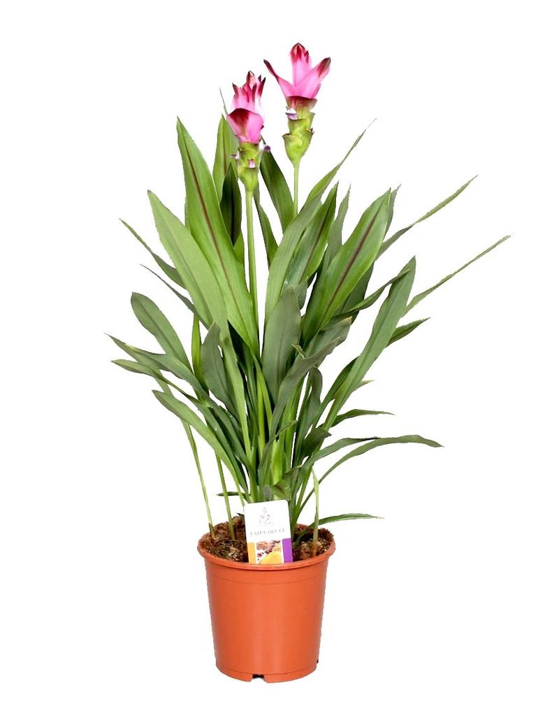 Kurkuma wąskolistna (Curcuma alismatifolia) Efektowne, kolorowe kwiaty, doskonale prezentujące się w doniczkach. Jasne stanowisko, rozproszone światło, temperatura 18-25°C, żyzna ziemia o lekkim kwaśnym odczynie. Podlewanie szklanką wody dziennie, nawilżacz powietrza, nawożenie co dwa tygodnie.